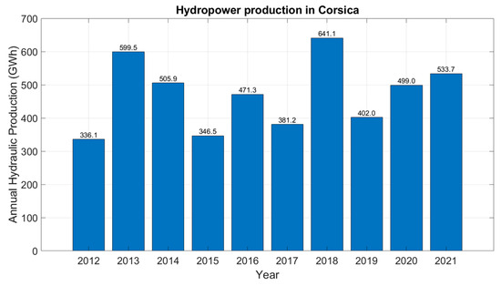 Concerning the electricity production, on an annual basis in 2021, 34% of the production came from renewable sources (23% hydraulics, 11% PV, 1% wind and biogas), 39% from fuel power stations and 26% provided by two electrical cables connecting Corsica to Italy and Sardinia. In 2013, the share of the hydraulic production in the electrical energy mix was around 45% mainly due to a good rainfall for only 26% in 2017. The annual variability of the water resource is high: as seen in Figure 1, from 2012 to 2021, the hydraulic production varies annually from 336 GWh (in 2012) to 641 GWh (in 2018), i.e., more than a factor of 2 between lowest and highest hydraulic production [24].