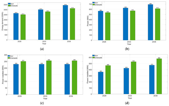 Looking at the Corsican EPS in the years to come, forecasts are made based on two different prospective scenarios: Azur and Emeraude. Both scenarios project various future Corsican EPS scenarios based on demographics, GDP per capita, electricity management policies, and future energy uses for transportation (electric vehicles). Figure 2 shows the annual average energy (Figure 2a) and hourly peak power (Figure 2b) projected for the forecasted years 2028, 2033, and 2038. Figure 2c,d, on the other hand, depict the projected installed capacity of renewable energy facilities in the two different scenarios [24].