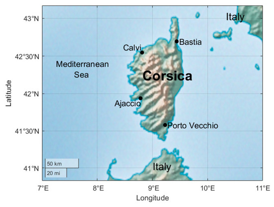 The analyses outlined above are applied to the case study of Corsica (an island in the Mediterranean Sea) but can be extended to other geographical regions. The choice of Corsica is motivated by several reasons: it is one of the most important islands in the Mediterranean area, insular electric power systems (IEPSs) are like ‘laboratories’ for power system analyses, and the Mediterranean basin will be a hotspot for climate change [21]. To assess the temporal variability of the considered atmospheric quantities, analyses are conducted on an annual and seasonal basis (winter and summer). To assess the spatial variability, four locations in Corsica are selected based on criteria such as installed generation capacity (generation) and the presence of load (demand).