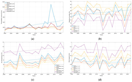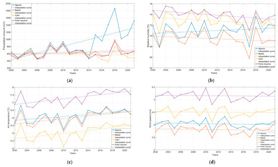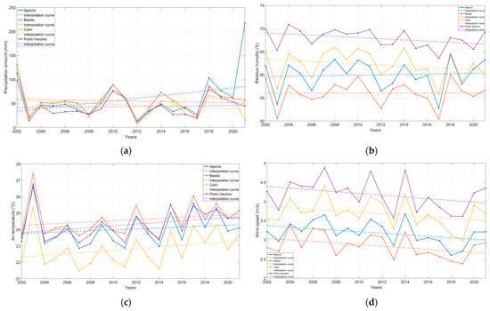 Figure 4a reveals that the four locations had similar trends in cumulative annual precipitation amounts until 2014, the year from which the Ajaccio site significantly deviated from the other three. This different trend in precipitation in Ajaccio finds correspondence in the RH trends: Ajaccio’s RH trend is the only one among the four locations that shows an increase (Figure 4b). The decreasing trends in RH are accompanied by increasing trends in air temperatures; Ajaccio has the lowest slope of the interpolating line (Figure 4c). Figure 4d shows how, for wind speeds, there is decrease in the annual average hourly values. Porto Vecchio has proven to be a site with a higher annual average hourly relative humidity, temperature, and wind speed compared to the other locations (Figure 4c,d).