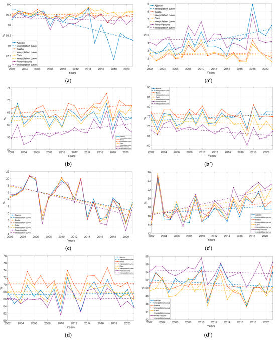Regarding relative humidity, annual percentage trends are more pronounced compared to precipitation; Ajaccio shows opposite trend slopes compared to the other three locations, whose trend slopes are consistent with each other (Figure 7b,b′). The trends in Porto Vecchio show the highest slopes.
