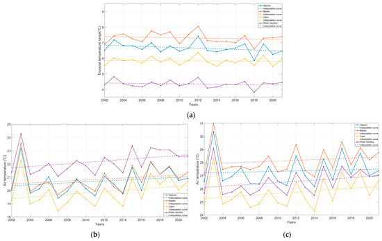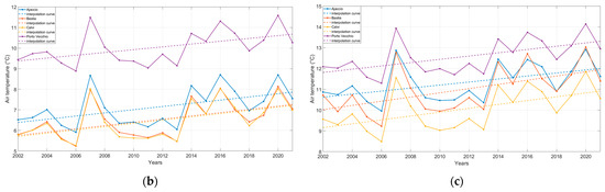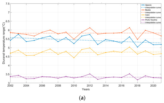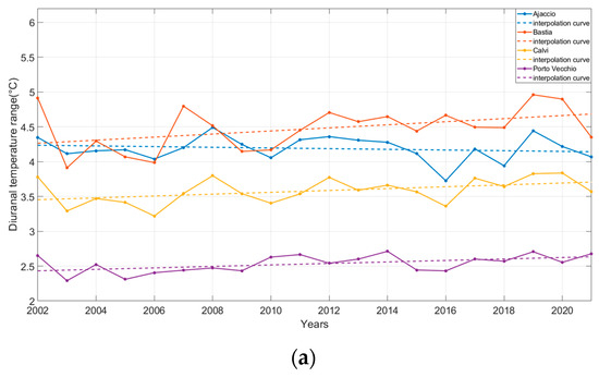 In the summers of the last 20 years, the opposite trend occurred compared to the winter months: increased more than (with the exception of Ajaccio, which had a greater increase in compared to Tmax in both winters and summers). This has resulted in decreasing trends in DTR for all Corsican locations (Figure 10a). Specifically, increased by 0.35 °C/dec in Ajaccio, 0.37 °C/dec in Bastia, 0.50 °C/dec in Calvi, and 0.53 °C/dec in Porto Vecchio, while increased by 0.15 °C/dec in Ajaccio, 0.28 °C/dec in Bastia, 0.48 °C/dec in Calvi, and 0.46 °C/dec in Porto Vecchio.