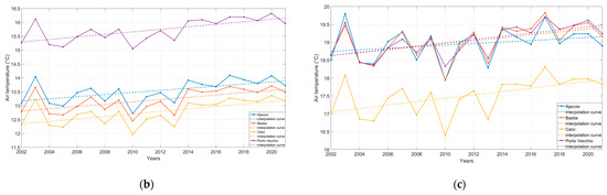 All four Corsican locations have experienced an increase in average hourly temperatures both in winter (Figure 5c) and summer (Figure 6c), with steeper trends in winter than in summer. Specifically, in winter, the rates of increase in average hourly temperatures were 0.76 °C/dec for Ajaccio, 0.88 °C/dec for Bastia, 0.85 °C/dec for Calvi, and 0.72 °C/dec for Porto Vecchio. In summer, the rates were 0.28 °C/dec for Ajaccio, 0.35 °C/dec for Bastia, 0.51 °C/dec for Calvi, and 0.52 °C/dec for Porto Vecchio.