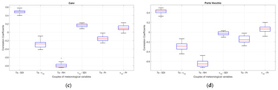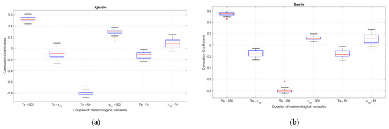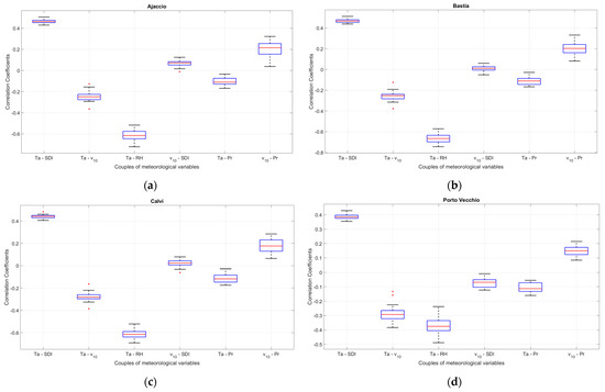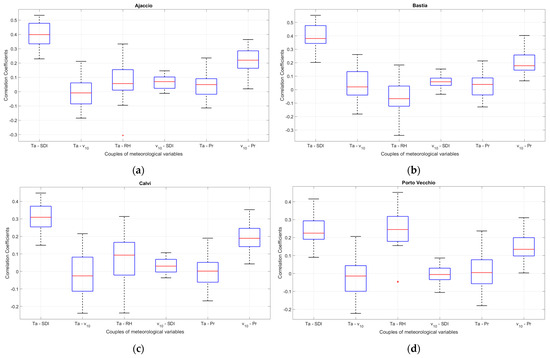 As explained in Section 2.2, the quantitative correlation analysis is conducted here by applying the correlation coefficient r to the pairs of meteorological variables under consideration, for each year of data, both on an annual and seasonal basis. Figure 11, Figure 12 and Figure 13 show boxplots of the distributions of the r values obtained on an annual, winter, and summer basis for the four Corsican locations.