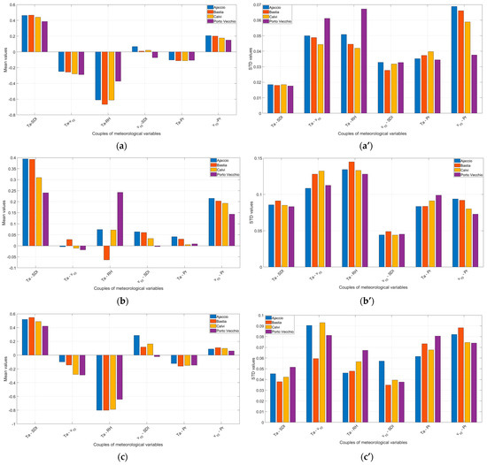 Trends of (a) percentage of annual hours with Pr below the winter climatic average; (a’) percentage of annual hours with Pr above the summer climatic average; (b) percentage of annual hours with RH below the winter climatic average; (b’) percentage of annual hours with RH above the summer climatic average; (c) percentage of annual hours with Ta below the winter climatic average; (c’) percentage of annual hours with Ta above the summer climatic average; (d) percentage of annual hours with below the winter climatic average; (d’) percentage of annual hours with above the summer climatic average.