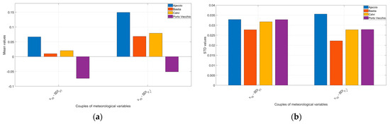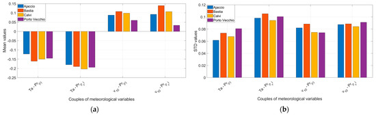 In the winters of the last 20 years, Corsican locations experienced an increasing trend in DTR (Figure 9a), except for Ajaccio. Ajaccio had a decrease in DTR of °C/dec, which was due to increasing by 0.77 °C/dec, while increased by 0.73 °C/dec. Similar increases occurred in Porto Vecchio, where increased by 0.68 °C/dec, and increased by 0.79 °C/dec. Bastia and Calvi had the highest increases in and : increased by 0.79 °C/dec in both Bastia and Calvi, while increased by 1.01 °C/dec in Bastia and by 0.93 °C/dec in Calvi (Figure 9b,c).