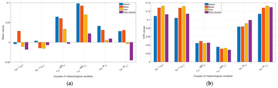 In this section, the results of the correlation analysis conducted on the pairs of considered atmospheric variables are presented. Figure S4 (Supplementary Materials) shows the scatterplots of the pairs of considered variables. Scatterplots provide an idea of the linearity or lack thereof in the relationship between two variables, but they only offer qualitative insights that can sometimes be misleading. Moreover, in some cases, such as air temperature and SDI or air temperature and RH, it is possible to infer the signs of correlations, positive for the Ta-SDI pair and negative for the Ta-RH pair (see Figure S4), but despite that, it is not available a number that can quantify the degree of relationship between the variables. A quantitative analysis is therefore needed.
