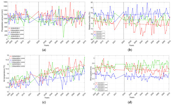 Historical trends of atmospheric variables: (a) comparison of annual precipitation amounts; (b) comparison of annual average hourly RH values; (c) comparison of hourly average temperatures on an annual basis; (d) comparison of annual average hourly wind speed values.