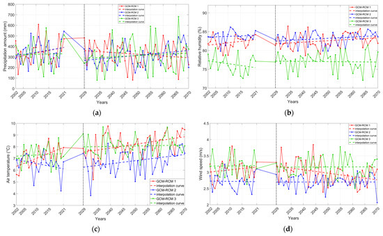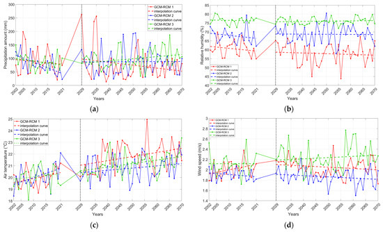 Historical trends of atmospheric variables: (a) comparison of summer precipitation amounts; (b) comparison of summer average hourly RH values; (c) comparison of summer hourly average temperature values; (d) comparison of summer average hourly wind speed values.
