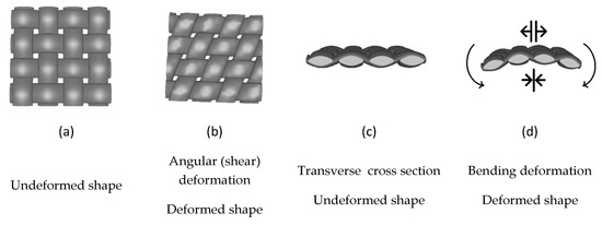 When the fabric is subjected to external mechanical stress, deformation occurs, causing thread displacement within the structure and thread-to-thread friction [25]. The displacements are more pronounced in knitted structures than in woven ones. Woven structures have a grid-like structure and two main axes of symmetry running in the warp and weft direction. Stretching the woven fabric can lead to zero or minimal thread sliding, but any deformation of the thread results in the stick-slip phenomenon occurring during bending and shear deformations of the fabric. Bending resistance is supported with a combination of tensile and compressive stresses that occur on opposite sides of the fabric plane. The bending of textile material is therefore a complex phenomenon involving several types of deformation such as tensile, bending, shear and compressive deformations. As all of these are relative movements on a microscopic or macroscopic level, it is clear that friction has a significant influence on the behaviour of the fabric (Figure 1).