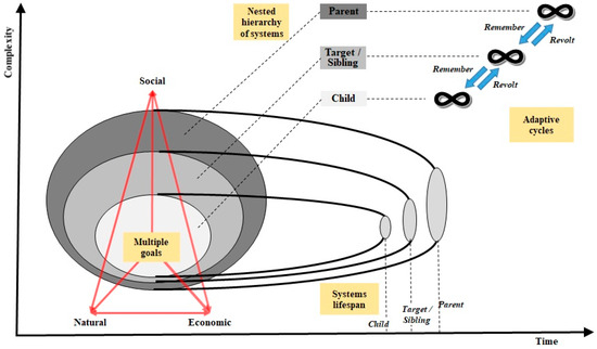 The SSoSs framework employs Wilson’s [29] terminology of parent–sibling–child systems to depict hierarchical relationships between these systems. The central system of concern is referred to as the “target” system. This target system interacts with “sibling” systems (systems of comparable complexity and spatial influence), “parent” systems (more complex or spatially extensive systems than the target), and “child” systems (systems of lesser complexity and narrower spatial influence than the target).