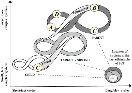 The adaptive cycle constitutes the fourth facet of the SSoSs framework. According to Gunderson and Holling [31], the prevailing notion is that systems typically do not undergo mere termination; instead, they experience a continual process of evolution. These authors stated that this is a dynamic process with parallels to ecological lifecycles consisting of four stages: growth/development (A), conservation/consolidation (B), release/creative destruction (C), and re-organization/destructuring (D) (Figure 2).