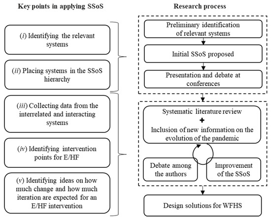 The SSoSs hierarchy was continually improved through debates among the authors, taking into account new information as the pandemic evolved (e.g., vaccine development and the emergence of variants) and fostering the generation of ideas about intervention points and practical considerations (key points (iii), (iv), and (v) in applying the SSoSs). This iterative process allowed us to identify innovative design solutions for WFHSs using the SSoSs framework as presented in the following sections.