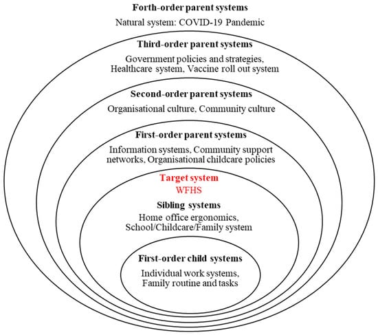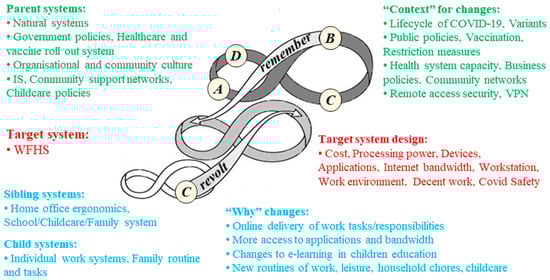 Considering the impacts of COVID-19 on work at the lowest level, family routines and individual work systems are considered as relevant child systems. Family routines (e.g., bedtime, meal times, etc.) in most cases can adapt relatively quickly so that the residents of the house can adapt to new routines of work, leisure, household chores, and/or childcare. If work undergoes a permanent transformation, remaining predominantly online even after the relaxation of restrictions or the conclusion of the pandemic, individual work systems (referred to as the child system) may either resist or align with this change (revolt). For instance, the extensive use of personal laptops may require new security procedures and corporate gateways for services or e-learning, or the organization will have to provide compatible equipment. The design of the WFHS itself raises several design considerations, such as hardware processing power, end-user computing applications, internet connections, communications, devices, home workstations, and considerations of the “work” environment. Anthropometric, environmental, and psychosocial factors need to be taken into account in the design of WFHSs [70]. In addition, it is necessary to recognize the multiple goals to be pursued, for example, optimizing the cost of the construction and operation of the system (i.e., the economic goal), achieving a work–life balance (i.e., the social goal), and promoting a healthy work environment to avoid COVID-19 infection and community spread (i.e., the nature goal).