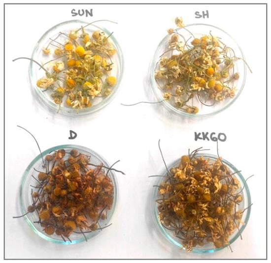 - Azizi, M.; Rahmati, M.; Ebadi, T.T.; Hasanzadeh, M. The effects of different drying methods on weight loss rate, essential oil and chamazolene contents of chamomile (Matricaria recutita) flowers. Iran. J. Med. Aromat. Plants 2009, 25, 192–201. [Google Scholar]