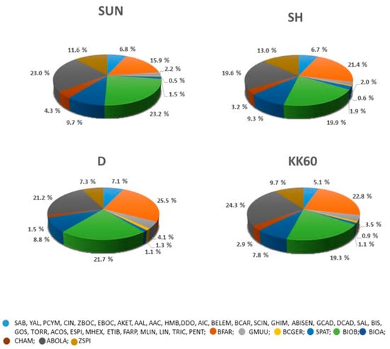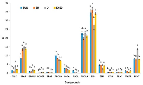 - Adams, R.P. Identification of Essential Oil Components by Gas Chromatography/Mass Spectrometry, 4th ed.; Allured Publishing Corporation: Carol Stream, IL, USA, 2007. [Google Scholar]