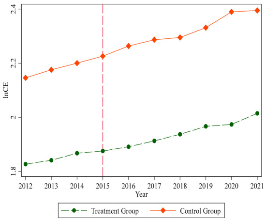 The primary premise of implementing the DID model is that both the treatment group and the control group should exhibit parallel trend hypotheses. In other words, when the experimental group is not subject to policy intervention, its time trend effect should theoretically be consistent with that of the control group [34]. Currently, there are two methods for testing parallel trend tests: the time trend chart and the event research method. The time trend chart, illustrated in Figure 1, demonstrates that the carbon pollution (lnCE) of the pilot in the treatment group and the control group is not systematically different over the time before 2015, indicating a parallel trend. Therefore, Figure 1 clearly illustrates that this study satisfies the prerequisite for utilizing the DID model.