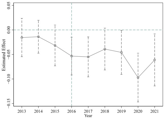 Compared to the time trend chart, the event research method is considered to be more accurate because the time trend chart relies on only subjective determination to identify whether there exists a pronounced divide. Within the study, this event research method is employed to conduct a parallel trend test using 2012 as the reference period. The results of this method are presented in Figure 2, wherein the horizontal axis denotes the year, the vertical axis denotes the estimated effect value of the processing effect, the dots in the figure represent the policy effect of the treatment group established in the National Big Data Comprehensive Pilot Zone in the year, and the dashed line represents the 10% confidence interval. It is evident from the figure that there was no statistically significant difference in the carbon pollution reduction effect between the treatment group and the control group before the establishment of the National Big Data Comprehensive Pilot Zone.
