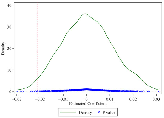 To examine whether the regression results in Table 2 are influenced by missing variables and random factors, a permutation test is employed to conduct a placebo test [35]. This involves randomly sampling all cities and policy time, selecting 57 cities each time, and generating a random time. The 57 cities selected each time are considered the dummy treatment group, while the remaining cities serve as the dummy control group. This process is repeated 500 times to obtain the regression coefficients of the interaction terms of the 500 dummy treatment groups and their policy time. The coefficient distribution graph presented in Figure 3 indicates that the coefficients of the spurious did terms are centered around zero, and the majority of the corresponding p-values are bigger than 0.1. These results are consistent with the normal distribution. Moreover, in column (7) of Table 2, the coefficient did for the interaction term is −0.021, which is located at the low end of the distribution of the coefficient obtained through the permutation test. The placebo test indicates that there are no significant problems with missing variables or random factors interfering in the model setting. As a result, the conclusions of the previous study are considered to be relatively robust.