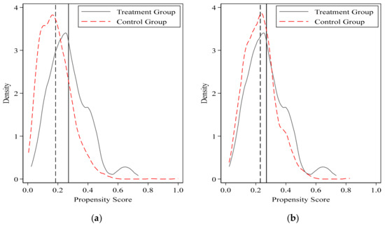 Propensity score probability distribution density function. (a) Propensity score before matching; (b) propensity score after matching.