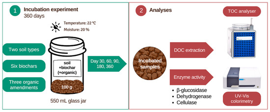 The aim of the presented research was to evaluate the DOC pool and microbial activity in biochar-amended soils, considering biochars derived from six different feedstocks and their co-application with other organic amendments commonly used in agriculture: compost, manure, and fresh legume biomass. We measured the activity of β-glucosidase (GA), dehydrogenase (DHA), and cellulase (CA), recommended as indicators of soil organic matter (SOM) turnover [20], along with DOC content. On that basis, the carbon sequestration potential of the tested biochars and the impact of organic amendments on carbon pool dynamics were evaluated.