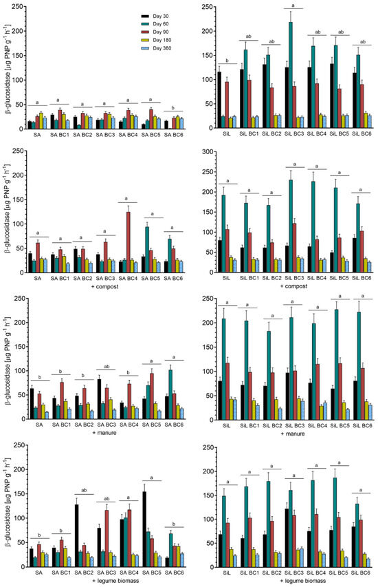 β-glucosidase activity among tested treatments. SA = sandy soil, SiL = silt loam soil, BC1-6 = biochars (see Table 1). Values are means ± SD from three replicates. Letters indicate homogenous groups considering biochar type as a main factor (p < 0.05).