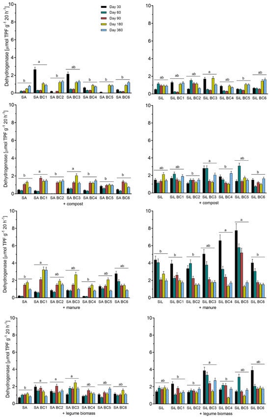 Dehydrogenase activity among tested treatments. SA = sandy soil, SiL = silt loam soil, BC1-6 = biochars (see Table 1). Values are means ± SD from three replicates. Letters indicate homogenous group considering biochar type as a main factor (p < 0.05).