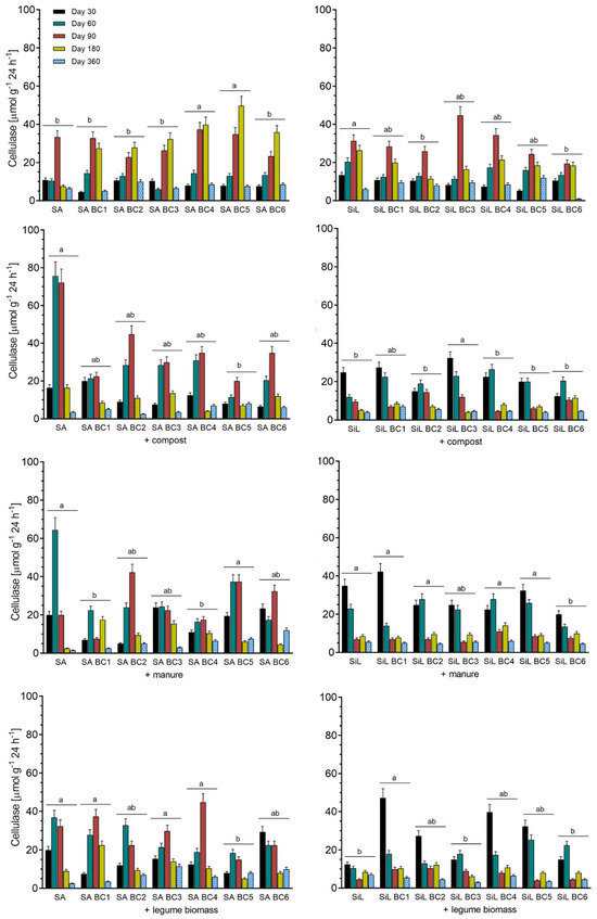Cellulase activity among tested treatments. SA = sandy soil, SiL = silt loam soil, BC1-6 = biochars (see Table 1). Values are means ± SD from three replicates. Letters indicate homogenous group considering biochar type as a main factor (p < 0.05).