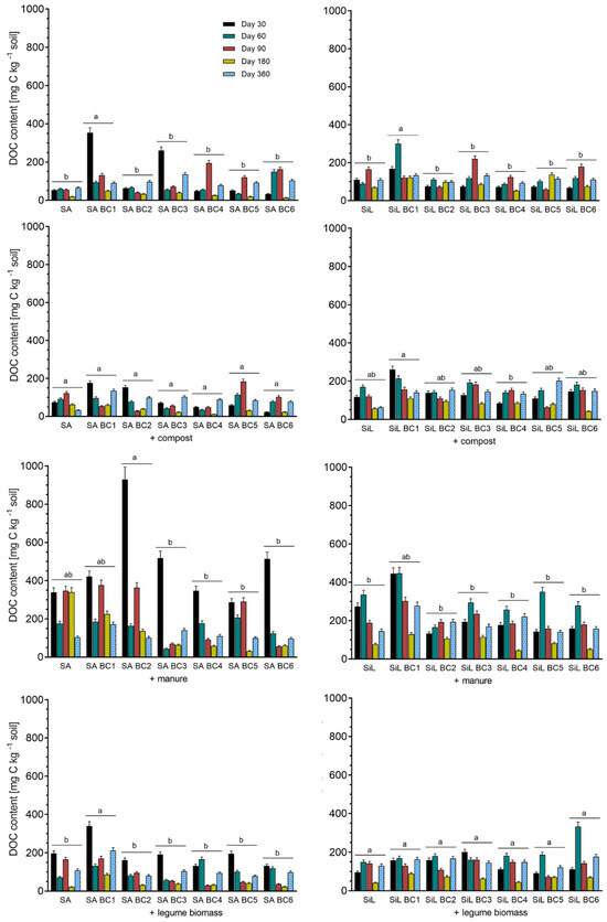 Dissolved organic carbon (DOC) represents the mobile pool of organic matter, easily available to microbes. The application of biochar impacted the content of DOC; however, the effect was distinct in both tested soils. In SA treatments, the DOC content increased rapidly after BC application up to the first 90 days of incubation. The highest content of DOC was observed in SA BC1 and SA BC3, while some biochars, e.g., SA BC2, did not contribute to the process (Figure 6). In SA BC soils treated with compost, no significant changes were observed between the treatments, while the application of manure to SA BC soils increased the DOC content and surprisingly the highest peak was observed on SA BC2 with the lowest initial content of DOC. The application of raw organic matter in the form of legumes along with biochars did not significantly affect the DOC, with the exception of SA BC1 treatment (Figure 6). In SiL treatments, a significant (p < 0.05) increase in DOC after biochar application was only observed for SiL BC1, and similarly to SA, the effect of biochar application on DOC content was observed after 60 to 90 days of incubation. The co-application of biochars with compost and legume biomass did not significantly affect the DOC in silty soil, while the greatest significant (p < 0.05) effect was observed in the SiL BC1 + MA treatment. Depending on the variant of the experiment, the maximum concentrations of DOC were observed at different stages of incubation. In treatments with BC1 (kitchen waste biochar), DOC content was particularly high at the beginning (days 30 and 60). In soils amended with BC4 (wheat straw), BC5 (sunflower husks), or BC6 (wood chips biochar), the maxima of DOC concentration were observed at 60 and 90 days of incubation. Moreover, after 360 days, the DOC concentrations were higher in almost every treatment than at their previous measurement on day 180, probably due to the decomposition of tested organic amendments. Considering the effect of biochar type on the DOC content among the treatments, kitchen waste biochar (BC1) significantly (p < 0.05) increased the labile carbon pool in almost every tested combination. In most cases, however, no significant differences at (p < 0.05) were noted between studied biochars, considering the entire incubation period.