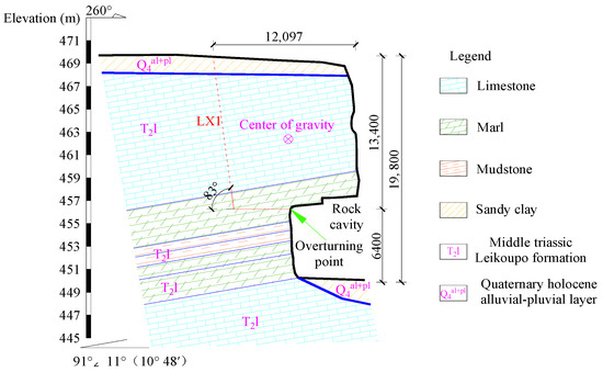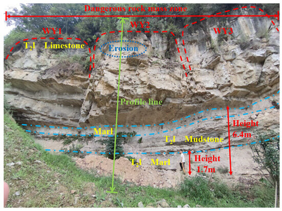 The lithology of the dangerous rock mass is composed of limestone and marl of the Leikoupo Formation (T2l) in the Middle Triassic. The base and rock cavity of the dangerous rock mass mainly consist of marl and thin-layered mudstone, and the top of the rock mass is covered by sandy clay of the Quaternary Holocene alluvial–pluvial layer (Q4al+pl), with a thickness of about 1.5 m and dense vegetation. The on-site photo of the dangerous rock mass zone in Luoyi Village and the sectional profile of the WY2 dangerous rock mass are shown in Figure 1 and Figure 2, respectively. Based on the geological conditions of the dangerous rock mass zone in Luoyi Village, and referring to the rock mass parameter values from references [30,31], the physical and mechanical parameters of the WY2 dangerous rock mass and its structural planes are listed in Table 2.