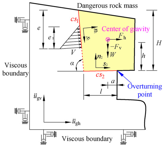 The stability of the toppling dangerous rock mass is determined mainly by the tensile strength of the back edge main structural plane of the rock mass and the tensile strength between the dangerous rock mass and the foundation. Therefore, the dynamic failure mode of the toppling dangerous rock mass is simplified into a dynamic model controlled by the main structural plane (cs1) and rock layer interface (cs2). This article considers both horizontal and vertical seismic actions and establishes a dynamic calculation model for the toppling dangerous rock mass with the center of gravity located inside the overturning point, as shown in Figure 3 [32].