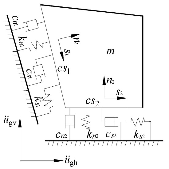 The dynamic response model of the toppling dangerous rock mass is simplified using the method of concentrated mass. The toppling dangerous rock mass is considered as a rigid body and is equivalent to a single-degree-of-freedom system, and its two main control surfaces are simulated using a mass viscoelastic model [34], where springs and dampers are connected in parallel to simulate the main control surface. Therefore, a mass viscoelastic model for dynamic response analysis of the toppling dangerous rock mass is established, as shown in Figure 4. In the figure, m is the mass of the dangerous rock mass; cn1 and cs1 are the normal and shear damping coefficients of the main control surface cs1, respectively; kn1 and ks1 are the normal and shear stiffnesses of the main control surface cs1, respectively; cn2 and cs2 are the normal and shear damping coefficients of the main control surface cs2, respectively; and kn2 and ks2 are the normal and shear stiffnesses of the main control surface cs2, respectively.