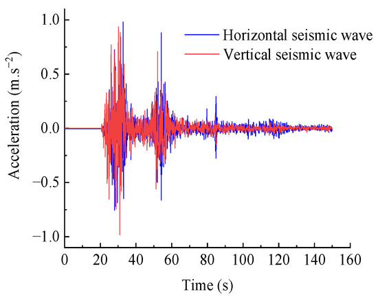where M, C, and K are the mass matrix, damping matrix, and stiffness matrix of the system, respectively; , , and are the acceleration, velocity, and displacement responses of the system under dynamic action, respectively; is the input seismic excitation acceleration; and t is the seismic excitation time.
