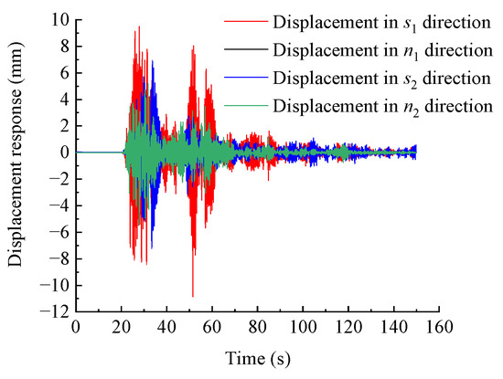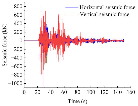 Using MATLAB programming for numerical calculations and substituting the relevant parameters of the WY2 dangerous rock mass into the calculation process of the Newmark-β method, the seismic displacement response result of the dangerous rock mass at any point in time can be obtained. The displacement response result of the WY2 dangerous rock mass is shown in Figure 6. Based on the seismic displacement response results of the toppling dangerous rock mass in different directions, the tangential and normal seismic forces generated by the dangerous rock mass on the two main control planes can be, respectively, obtained according to Equations (10)–(13), as shown in Figure 7. Finally, the horizontal and vertical seismic force response results of the dangerous rock mass can be calculated according to Equations (14) and (15), as shown in Figure 8.
