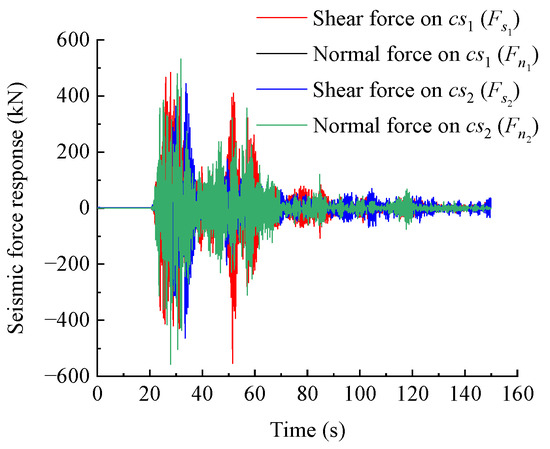 By solving the dynamic motion equations of the toppling dangerous rock mass, the tangential and normal displacements of the dangerous rock mass on the main control surfaces (cs1 and cs2) are obtained. Based on Equations (10)–(13), the shear force (Fs1 and Fs2) and normal force (Fn1 and Fn2) can be calculated.
