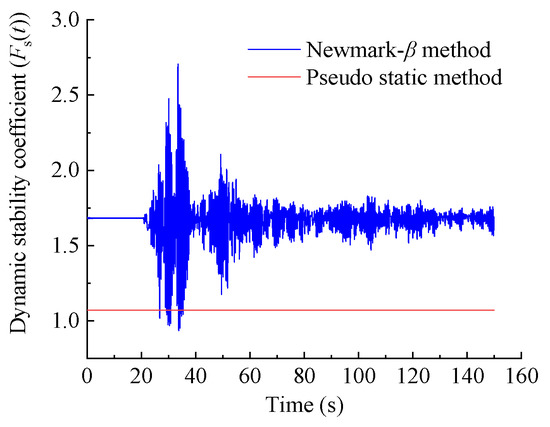 Based on the time history curve of the dynamic stability coefficient of the dangerous rock mass in Figure 9, when t = 33.7 s, the stability coefficient of the dangerous rock mass reaches its minimum value, Fs(t)min = 0.935. Therefore, according to the calculation method in Equation (17), the dynamic stability coefficient Fs of the WY2 toppling dangerous rock mass in Luoyi Village, calculated using the Newmark-β method, is 1.198. The stability coefficient calculated using the Newmark-β method is approximately 10.6% higher than that obtained from the pseudo-static method, which is consistent with the actual law.