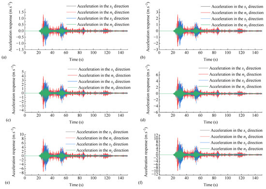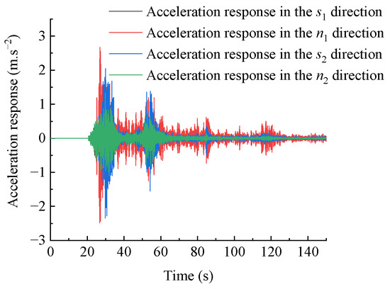 From Figure 11, it can be observed that the wavelet packet components of the acceleration response in the s1 and n2 directions of the dangerous rock mass are distributed in various frequency bands, with larger amplitude in bands 1~5 and smaller amplitude in bands 6~8. The wavelet packet components of the acceleration response in the n1 and s2 directions of the dangerous rock mass are mainly concentrated in bands 1~3, and the amplitudes are much larger than those in other bands. This indicates that under bidirectional seismic action, the frequency ranges of acceleration response signals in the s1 and n2 directions varies greatly, resulting in a smaller amplitude of the acceleration response and weakened destructive effect on the dangerous rock mass. However, the frequency of acceleration response signals in the n1 and s2 directions is concentrated in lower frequencies, leading to a larger amplitude of the acceleration response and a stronger destructive effect on the dangerous rock mass.