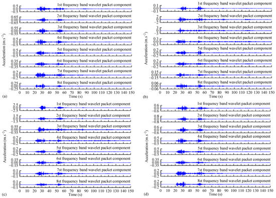 The dynamic response calculation method of the toppling dangerous rock mass based on the Newmark-β method established in this paper can solve the acceleration response of the dangerous rock mass under bidirectional seismic action, and the results are shown in Figure 10. Using MatlabR2019b software to implement the program, the acceleration response signals in the tangential and normal directions of the two main control planes of the dangerous rock mass can be subjected to wavelet packet transform, obtaining the wavelet packet components of the acceleration responses in different directions, as shown in Figure 11.