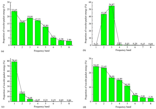 Energy proportion of each frequency band of WY2 dangerous rock mass in s1 direction (a), n1 direction (b), s2 direction (c), and n2 direction (d).
