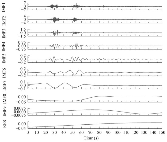 Firstly, the original Wolong seismic wave is decomposed using EMD, and the time-frequency characteristics of the seismic wave are preliminarily analyzed. The IMF components of each order obtained by decomposition are shown in Figure 13. From Figure 13, it can be seen that a total of nine IMF components are obtained after the EMD decomposition of the seismic wave, with the last component being the residual. Among them, the IMF2 has a high amplitude, rich frequency components, and a high identification clarity. Therefore, in this study, when calculating the marginal spectrum amplitude of the seismic acceleration response of dangerous rock mass, the IMF2 of the acceleration response in each direction can be selected for relevant calculations and analysis.