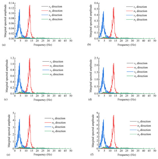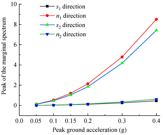 Based on the acceleration response results of the dangerous rock mass under different seismic loads, the HHT method is used to perform a Hilbert transform, resulting in the marginal spectral curves of the acceleration response in different directions, as shown in Figure 15. A diagram of Figure 15 is drawn to show that as the seismic load increases, the marginal spectral amplitudes of the dangerous rock mass in four different directions continuously increase. This indicates a linear increase in seismic energy, which is consistent with the actual situation. However, according to the identification method in Section 6.2, if the marginal spectral amplitudes show a linear increasing trend, it implies that the dangerous rock mass did not experience significant seismic damage under increasing seismic loads. This is obviously not in line with reality because the dynamic response calculation method based on the Newmark-β method used in this paper cannot reflect the dynamic response process of the dangerous rock mass after instability. Therefore, with the increase in seismic load, the marginal spectral amplitudes of dynamic response will exhibit a linear increase. Hence, the degree of change in marginal spectral amplitudes can be used to judge the failure mechanism of the dangerous rock mass under different seismic loads.
