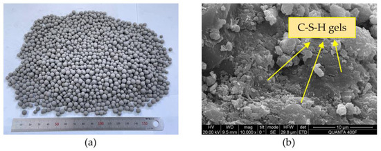 Characteristics of Cold-bonded Fly Ash Aggregate (CFAA): (a) the CFAA with particle sizes of 3–5 mm; (b) the Scanning Electron Microscope (SEM) image of the aggregate.