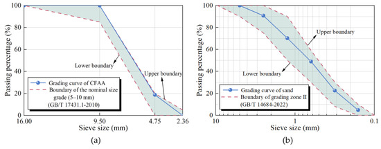 Sieve test results of CFAA and sand: (a) grading curve of CFAA; (b) grading curve of sand.