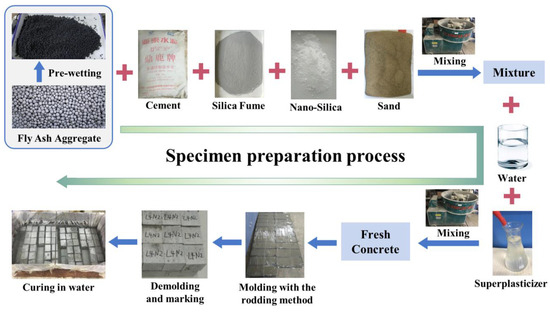 The preparation process of specimens is depicted in Figure 3. CFAAs must be soaked in water for an hour and then dried with a towel. In a concrete mixer, these aggregates were mixed with cementitious materials and sand for 30 s. After adding water and superplasticizer, the mixture continued to be stirred for 150 s. The resulting fresh concrete was poured into molds to prepare the cubic specimens (100 mm × 100 mm ×100 mm) and the prismatic specimens (100 mm × 100 mm × 400 mm). In order to prevent the aggregates from floating in the mortar, the rodding method was adopted to compact the concrete mixture. After 24 h, all specimens were demolded and marked with identification codes. The specimens would be moved into a water storage tank within 30 min and cured at ambient temperature until the required age.