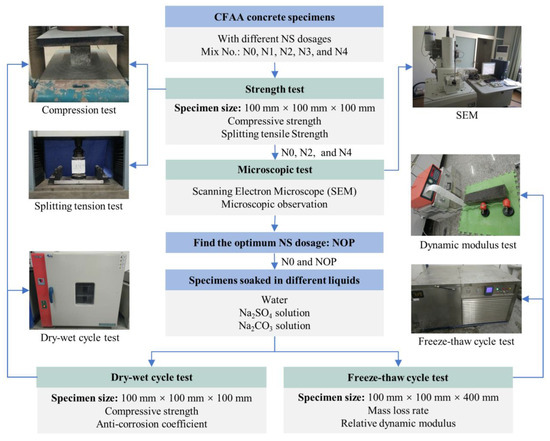 The strength tests and microscopic tests of CFAA concrete were conducted to determine the optimum NS dosage. The concrete with the optimum NS dosage was denoted as NOP. Subsequently, the durability in a salt-corrosion environment was studied through dry–wet and freeze–thaw cycle tests. The test procedure of the specimens is plotted in Figure 4.
