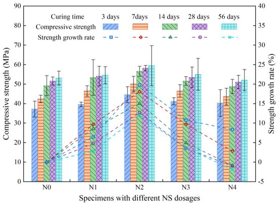 Figure 5 presents the compressive strength and strength growth rate of CFAA concrete containing different NS dosages. The compressive strength of the concrete rises with increasing curing time. For the concrete at the same age, the strength growth rates peak at 2 wt% NS dosage. In the concrete, NS not only reacts with Calcium Hydroxide (CH) to form extra C-S-H gels but also fills nanoscale pores in the cementitious matrix [54]. The compressive strength would increase due to the strengthened matrix when the NS dosage varies from 0 to 2 wt%. Note that replacing cement partially with NS can save cement but lead to the less production of the CH resulting from cement hydration. When the CH is used up, the excess NS scarcely continues to produce C-S-H gels, reducing the total amount of the C-S-H gel. Meanwhile, the excess NS particles might agglomerate together to form weak-zones in the concrete [65]. Therefore, the compressive strength would decrease when the NS dosage exceeds 2 wt%. This result shows the optimum NS dosage of the concrete is 2 wt%, i.e., N2 is the NOP in Section 2.5.