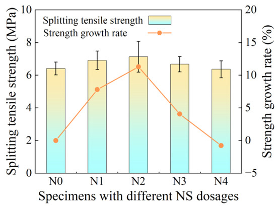Figure 6 illustrates the splitting tensile strength and strength growth rate of CFAA concrete containing different NS dosages. Compared with N0 concrete, the splitting tensile strength of N1, N2, N3, and N4 increases by 7.8%, 11.2%, 4.1%, and −0.8%, respectively. This result shows that the splitting tensile strength is the highest at 2 wt% NS dosage and decreases when the NS dosage varies from 2 wt% to 4 wt%. This is because the NS with a moderate dosage produces more C-S-H gels through the pozzolanic reaction to fill pores in the cementitious matrix. The splitting tensile strength of the concrete improves as the matrix porosity decreases. On the contrary, the excess NS increases the number of pores and weak-zones in the matrix, reducing the splitting tensile strength.