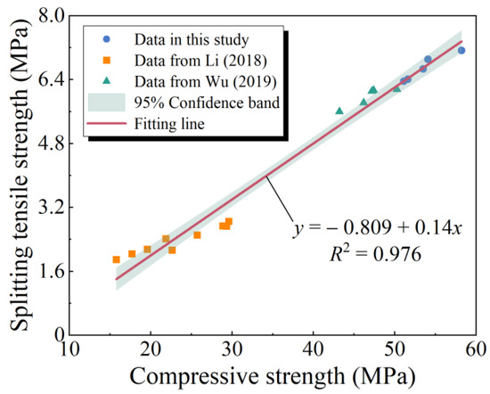 Based on the results above and the investigations [5,6], the relationship between splitting tensile strength and compressive strength for 28-day CFAA concrete can be obtained, as shown in Figure 7. Considering that the experiments had different specimen sizes, all data had been converted to the strength values of 100 mm cubes according to the standard GB/T 50081-2019 [63]. Through regression analysis, the equation of the fitting line can be expressed as follows: