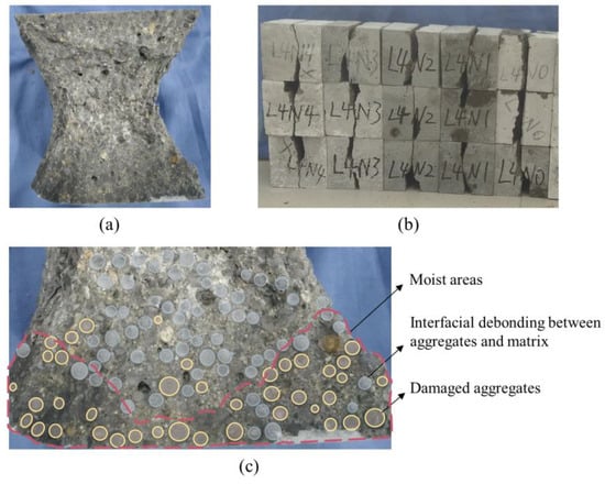 Failure morphologies of CFAA concrete specimens in strength tests: (a) after compression testing; (b) after splitting tensile testing; (c) details of the failed specimen after the compression testing.