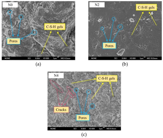 After 28 days of curing, the three most representative cubes, N0, N2, and N4, were made into SEM samples to observe their microstructure. The SEM images of the CFAA concrete (N0, N2, and N4) are presented in Figure 9. There are many pores among the C-S-H gels in the concrete without NS, as illustrated in Figure 9a. With the addition of 2 wt% NS, the number and size of pores decrease greatly, and the C-S-H gels become more homogeneous, as shown in Figure 9b. The reason is that NS reacting with CH produces the additional C-S-H gels to fill the big holes so that the matrix is enhanced. At the same time, NS can fill the nanoscale pores in the matrix to make the microstructure much denser. However, when the NS dosage increases to 4 wt%, pores and microcracks would arise in the matrix so that the microstructure gets loose, as depicted in Figure 9c. Compared with N0, larger pores are observed in N4. Furthermore, the initiation of microcracks might relate to the agglomeration of NS particles because the drying shrinkage of concrete can contribute to forming the microcracks around the agglomerated NS particles [37]. Overall, the moderate NS significantly optimizes the microstructure of the matrix, whereas the excess NS causes more microscale defects in the matrix.
